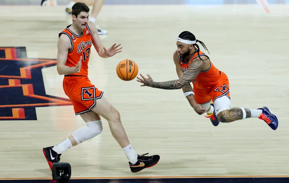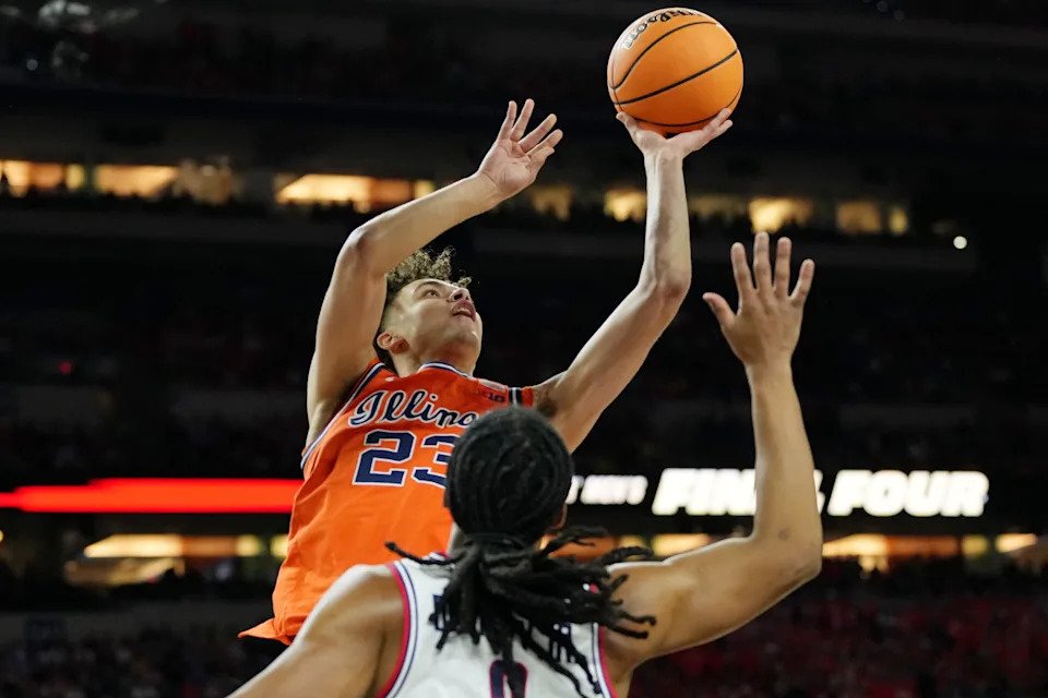 Kylan Boswell #4 of the Illinois Fighting Illini makes a pass while playing against UConn Huskies in the first half of the Final Four of the 2026 NCAA Men’s Basketball Tournament at Lucas Oil Stadium on April 04, 2026 in Indianapolis, Indiana.