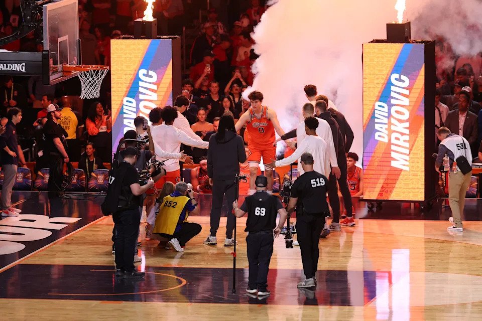 David Mirkovic #0 of the Illinois Fighting Illini interacts with teammates during player introductions prior to the game against the UConn Huskies in the Final Four of the 2026 NCAA Men’s Basketball Tournament at Lucas Oil Stadium on April 04, 2026 in Indianapolis, Indiana.