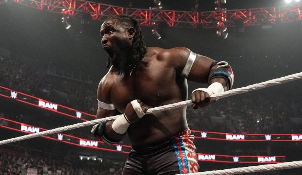 As the security tried to stop the Nigerian star from entering the ring, he laid them out, slamming and kicking his way clear. He even shoved Adam Pearce into the barricade before entering the ring.