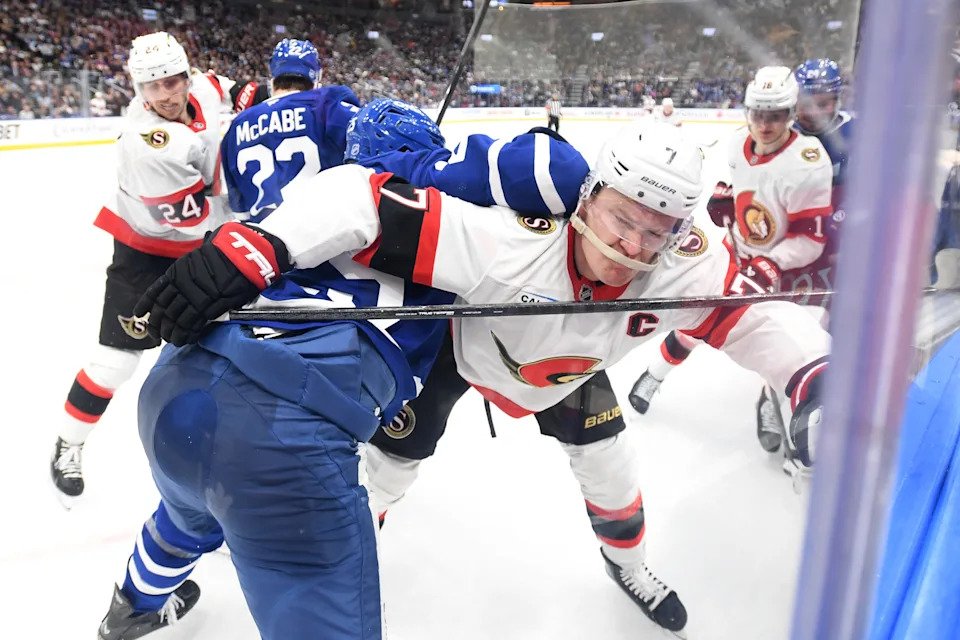 Feb. 28: The Ottawa Senators’ Brady Tkachuk (7) battles along the boards with the Toronto Maple Leafs’ Brandon Carlo in the second period at Scotiabank Arena.