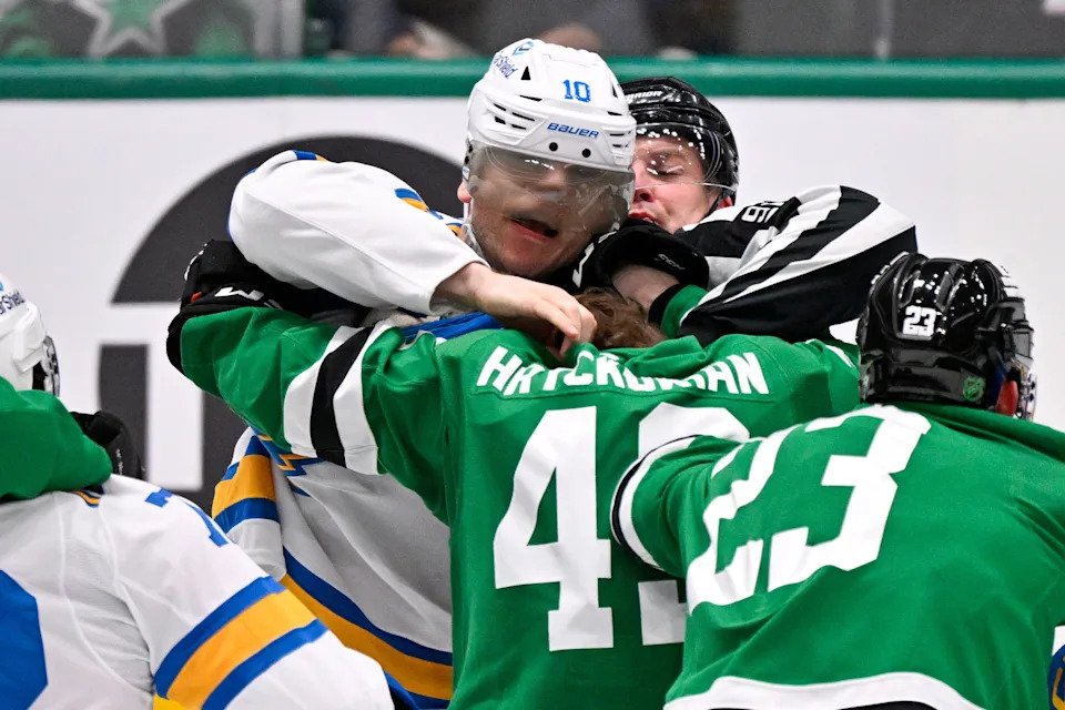 Feb. 4: The St. Louis Blues’ Brayden Schenn fights with the Dallas Stars’ Justin Hryckowian during the second period at the American Airlines Center.