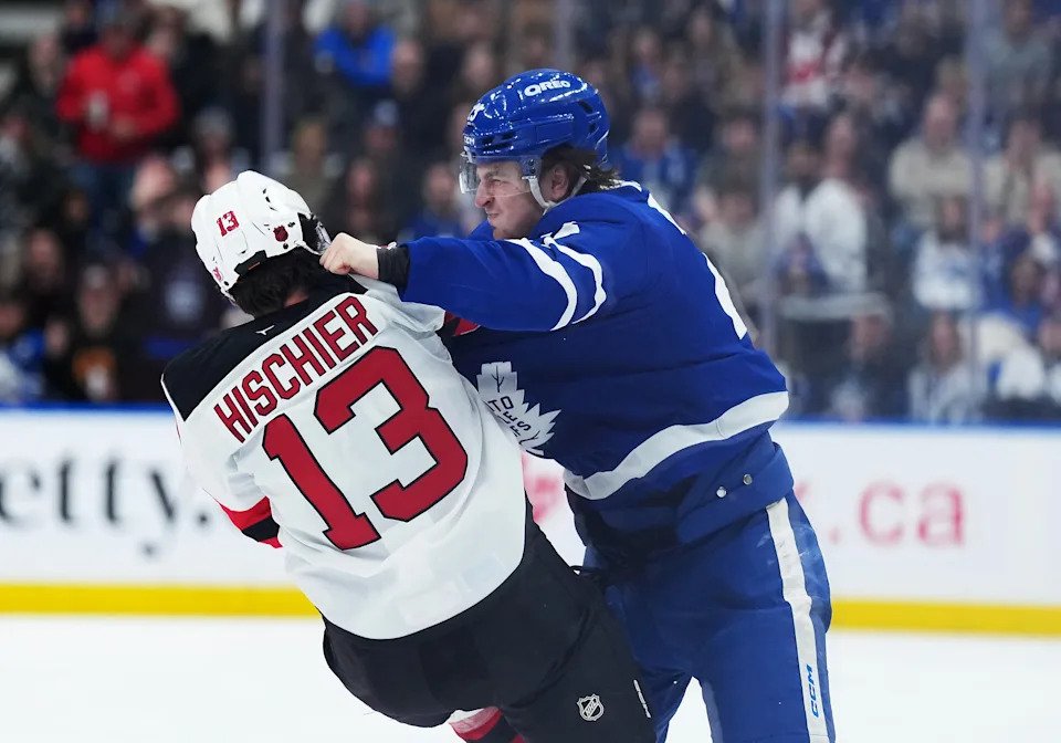Dec. 30: Toronto Maple Leafs left wing Matthew Knies (23) fights with New Jersey Devils center Nico Hischier (13) during the third period at Scotiabank Arena.