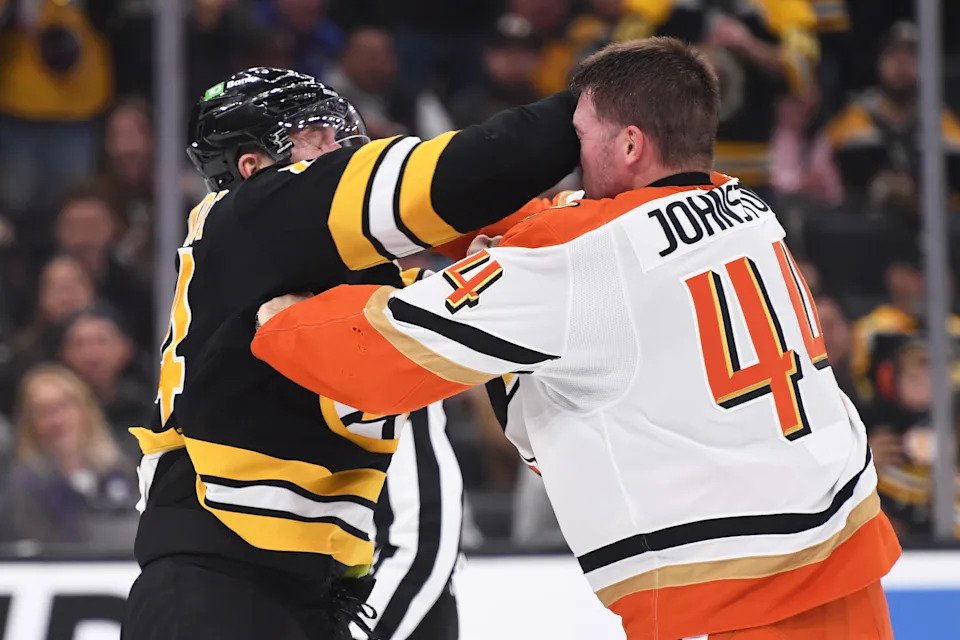 Oct. 23: Boston Bruins left wing Tanner Jeannot (84) fights with Anaheim Ducks left wing Ross Johnston (44) during the second period at TD Garden.