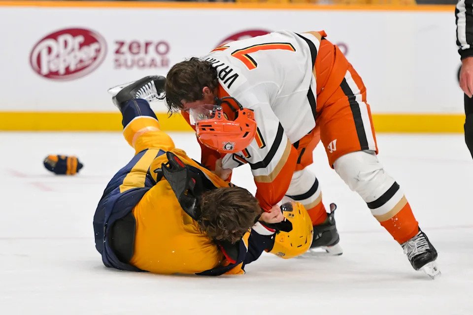 Oct. 21: Anaheim Ducks right wing Frank Vatrano (77) and Nashville Predators defenseman Adam Wilsby (83) fight during the third period at Bridgestone Arena.