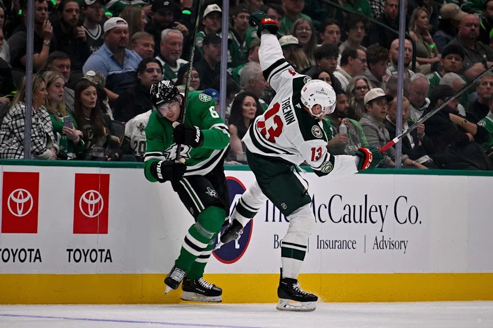 Oct 14: Dallas Stars defenseman Lian Bichsel (6) checks Minnesota Wild center Yakov Trenin (13) during the first period at the American Airlines Center.