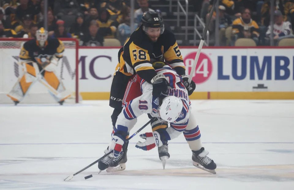 Oct. 11: Pittsburgh Penguins defenseman Kris Letang (58) checks New York Rangers left wing Artemi Panarin (10) during the first period at PPG Paints Arena.
