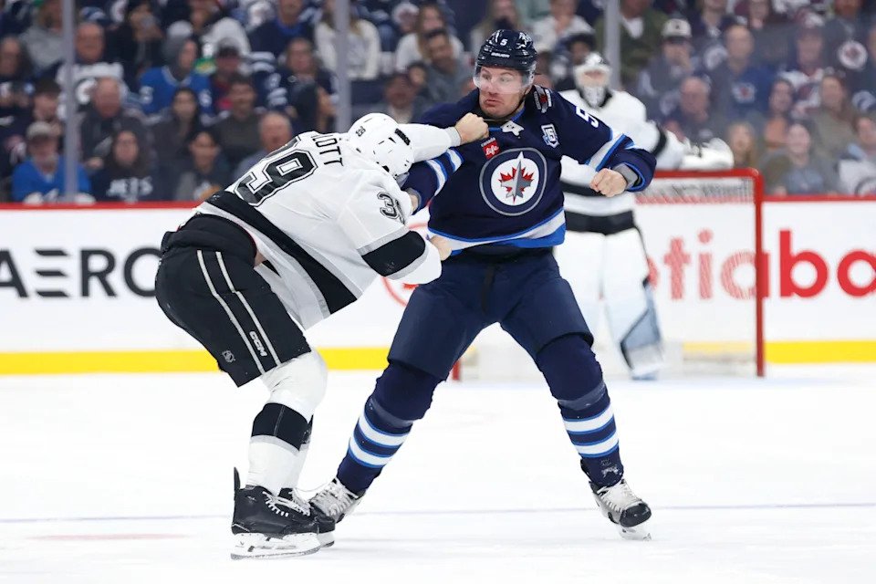 Oct. 11: Los Angeles Kings left wing Jeff Malott (39) and Winnipeg Jets defenseman Luke Schenn (5) fight during the first period at Canada Life Centre.