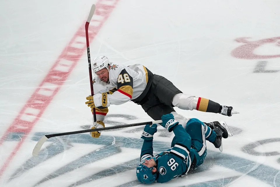 Oct. 9: Vegas Golden Knights center Tomas Hertl (48) checks San Jose Sharks center Philipp Kurashev (96) at center ice during the third period at SAP Center.