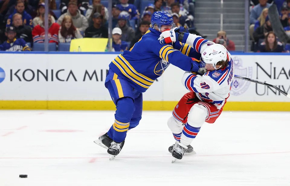 Oct. 9: Buffalo Sabres defenseman Rasmus Dahlin (26) checks New York Rangers left wing Artemi Panarin (10) as he goes after a loose puck during the second period at KeyBank Center.