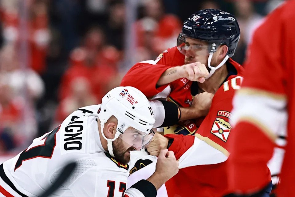 Oct. 7: Chicago’s Nick Foligno fights with Florida’s A.J. Greer during the first period at Amerant Bank Arena.
