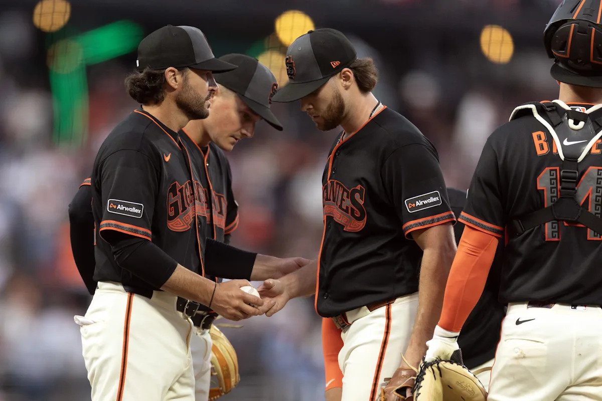 Apr 4, 2026; San Francisco, California, USA; San Francisco Giants manager Tony Vitello (left) takes the ball from starting pitcher Landen Roupp (65) as he makes a pitching change during the fifth inning at against the New York Mets Oracle Park. Mandatory Credit: D. Ross Cameron-Imagn Images | D. Ross Cameron-Imagn Images