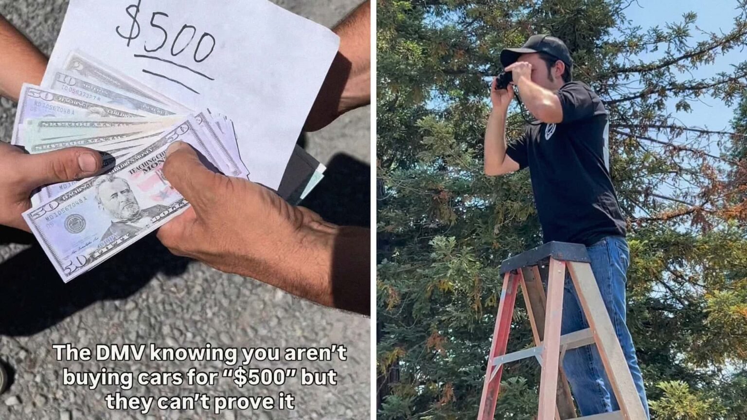 “The DMV knowing you aren’t buying cars for ‘$500’ but they can’t prove it,” reads the on-screen text.