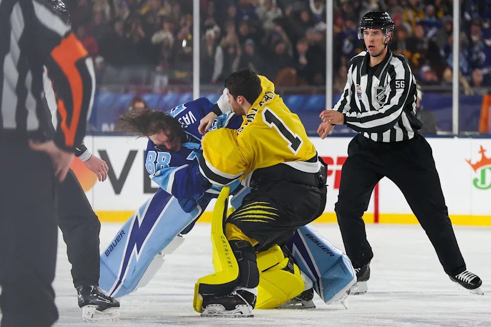 Feb. 1: Tampa Bay Lightning goaltender Andrei Vasilevskiy and Boston Bruins goaltender Jeremy Swayman fight during the second period of the 2026 Stadium Series game at Raymond James Stadium.