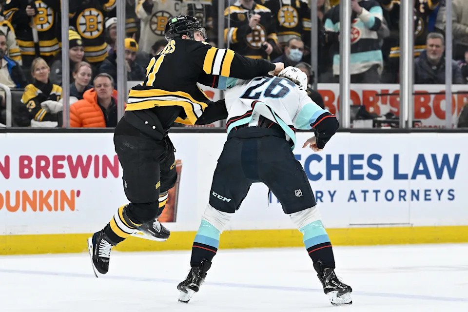 Jan. 15: Boston Bruins center Alex Steeves (21) and Seattle Kraken center Ryan Winterton (26) fight during the third period at TD Garden.