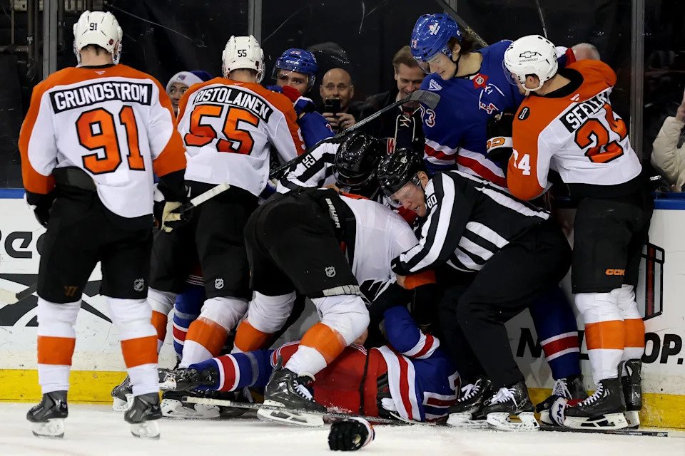 Dec. 20: Philadelphia Flyers left wing Nicolas Deslauriers (44) and New York Rangers left wing Brennan Othmann (78) are separated by officials and teammates after a fight during the second period at Madison Square Garden.
