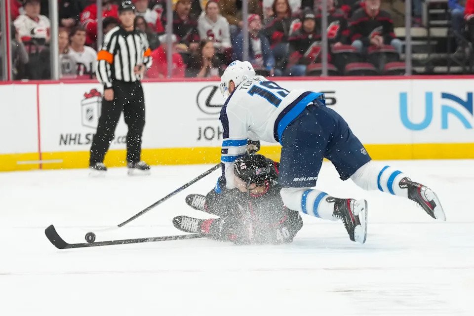 Nov. 28: Winnipeg Jets center Jonathan Toews (19) checks Carolina Hurricanes center Justin Robidas (46) during the first period at Lenovo Center.