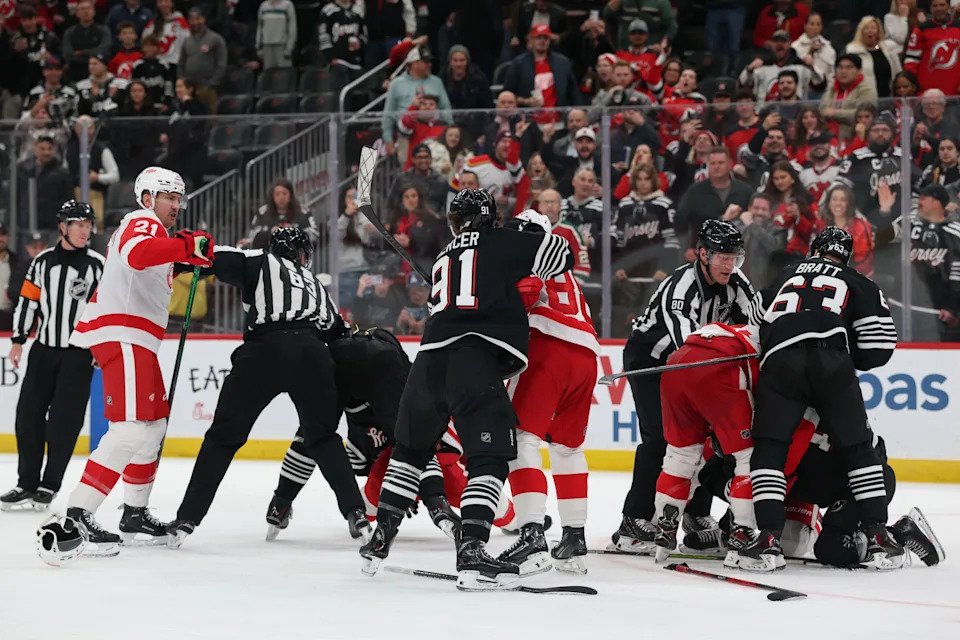 Nov 24: Members of the New Jersey Devils and the Detroit Red Wings fight at the end of the third period at Prudential Center.