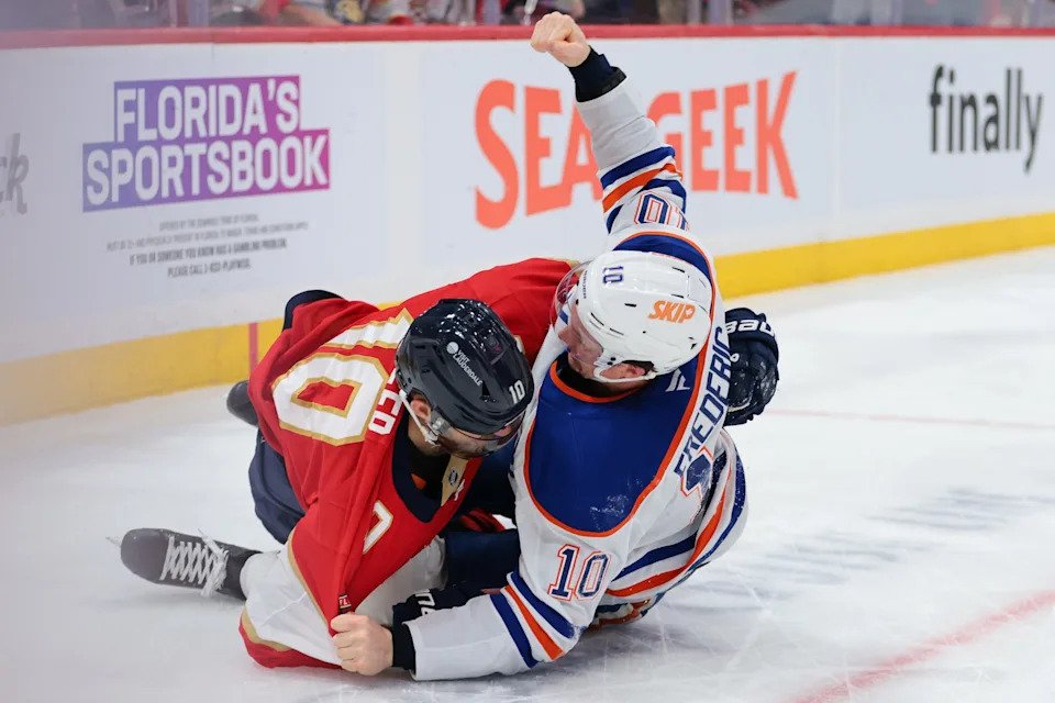 Nov. 22: Florida Panthers left wing A.J. Greer (10) and Edmonton Oilers center Trent Frederic (10) fight during the first period at Amerant Bank Arena.