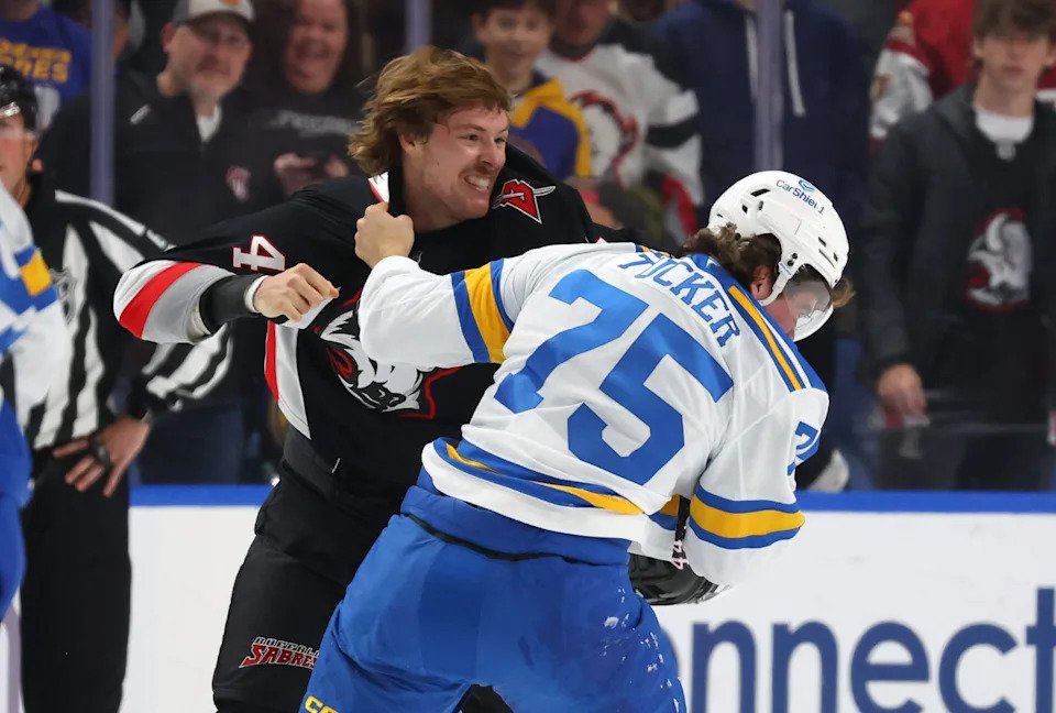 Nov. 6: Buffalo Sabres center Josh Dunne (44) and St. Louis Blues defenseman Tyler Tucker (75) fight during the first period at KeyBank Center.