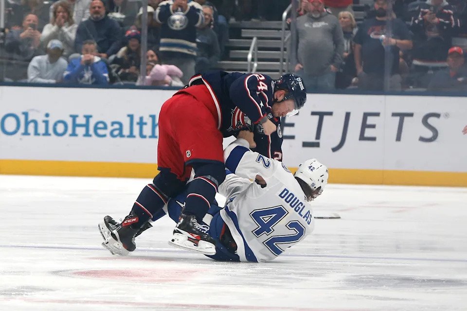 Oct. 18: Tampa Bay Lightning center Curtis Douglas (42) and Columbus Blue Jackets center Mathieu Olivier (24) fight during the first period at Nationwide Arena.