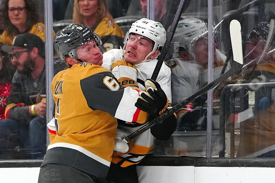 Oct. 16: Vegas Golden Knights defenseman Kaedan Korczak (6) checks Boston Bruins center Michael Eyssimont (81) during the first period at T-Mobile Arena.