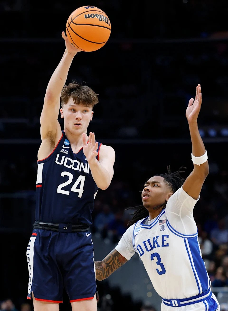 UConn Huskies guard Braylon Mullins (24) hits a go-ahead three-point basket late in the second half during an Elite Eight game of the East Regional of the men’s 2026 NCAA Tournament at Capital One Arena.