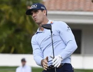 Jan 22, 2026; La Quinta, California, USA; Billy Horschel watches his tee shot on the ninth hole during the first round of The American Express golf tournament at the Nicklaus Tournament Course. Mandatory Credit: Denis Poroy-Imagn Images