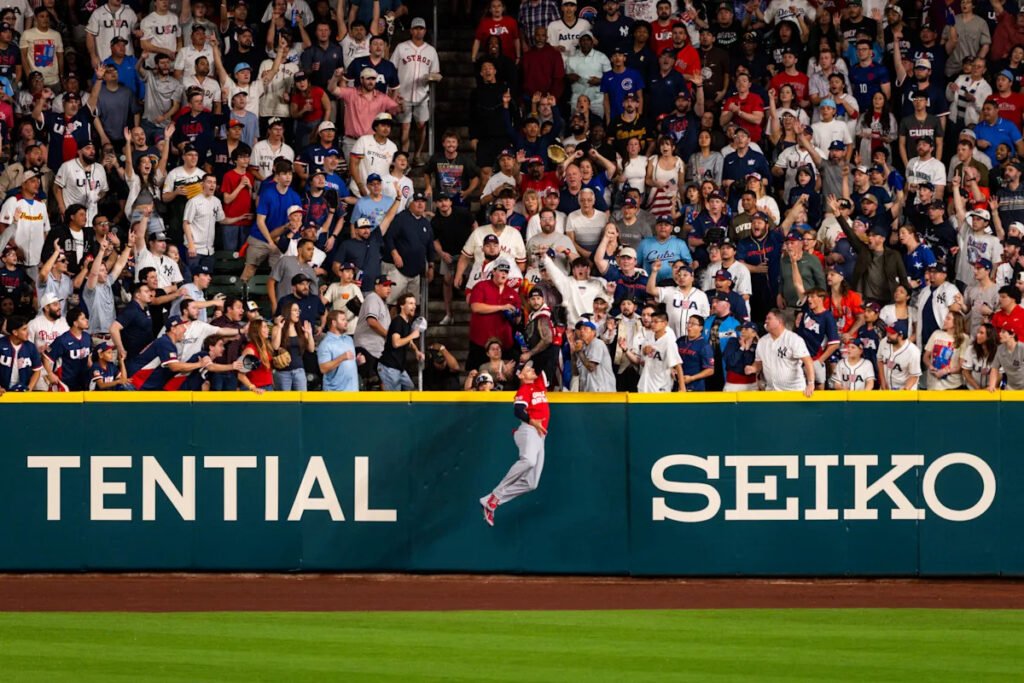 Smith walked twice and threw out a baserunner trying to steal second base against Great Britain. But he was also robbed of a solo home run in the second inning, when former teammate Trayce Thompson made a leaping catch over the right field wall to bring it back.